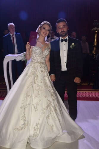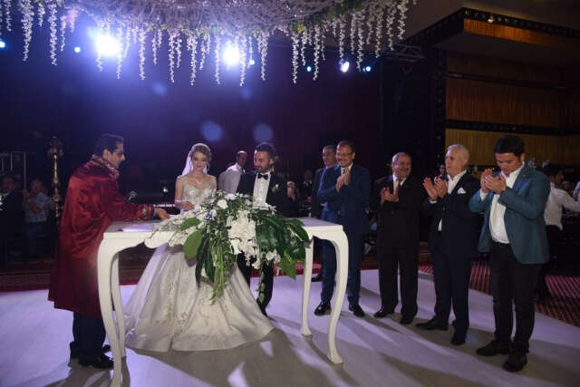 Salona alkışlar eşliğinde giren genç çiftin gecede nikah şahitliklerini Eski Devlet Bakanı ve AK Parti Milletvekili Hakan Çavuşoğlu, CHP Bursa Milletvekili Erkan Aydın, Mustafa Bozbey ve Çadsiad Başkanı Halil İbrahim Kuzucu alkışlar eşliğinde yaptı.