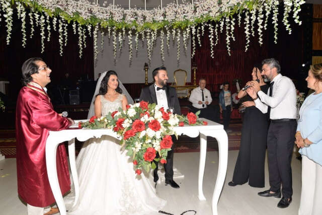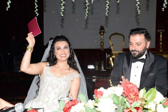 Karşılıklı ‘evet’lerin ardından gelin hanım heyecanını evlilik cüzdanını kaldırarak tüm konuklar ile paylaştı .