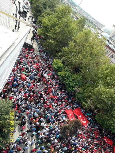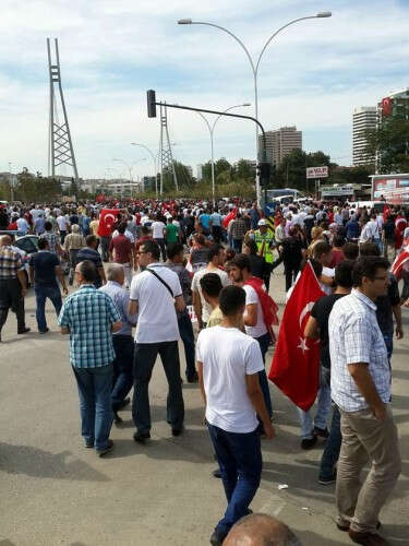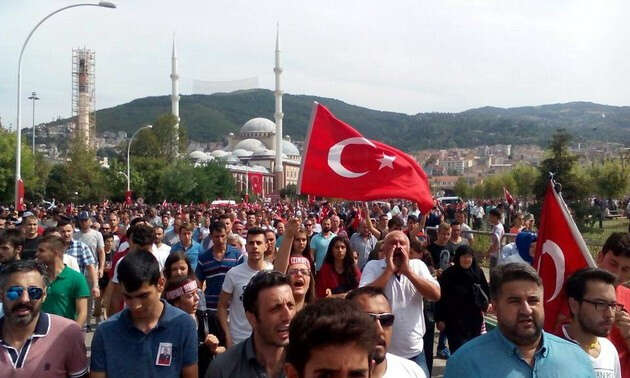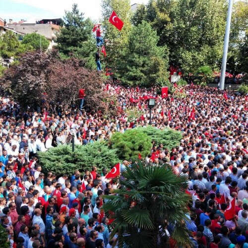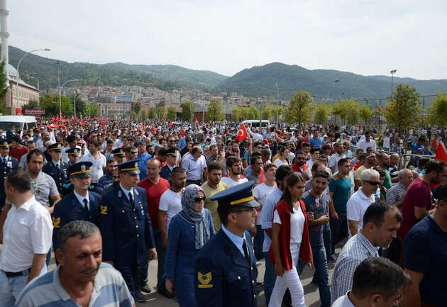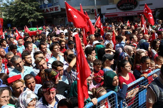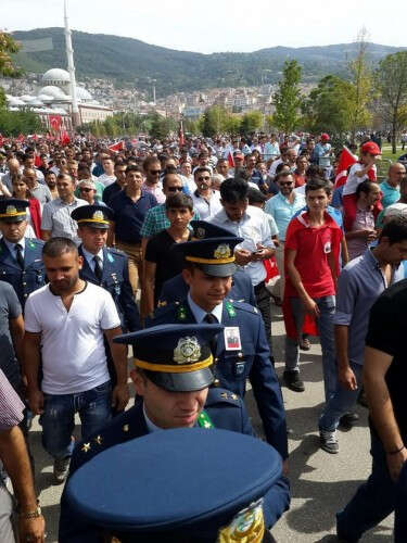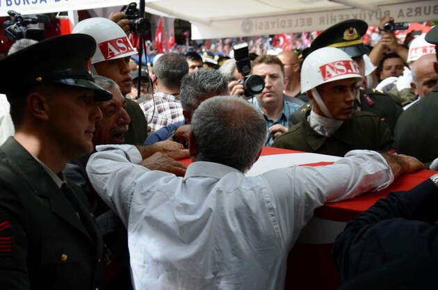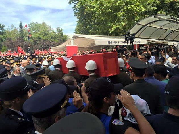 Bursalılar cenaze töreninde tekbirin yanısıra, "Kahrolsun PKK, Şehitler Ölmez Vatan Bölünmez, Şehidim hakkını helal et bize" sloganları atıyorlar.