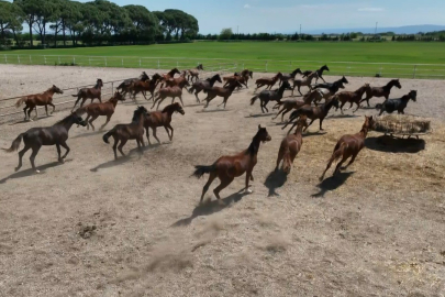 Bugün pistlerde koşan Arap atlarının yarısından fazlasını yetiştiren işletmede büyük bir titizlikle yetiştirilen Türk Arap atları drone ile görüntülendi. Her gün belli saatlerde açık alana salınan atların enerjilerini atmaları, koşuşturmaları ve birbirleriyle oynaşmaları görüntülere yansıdı.