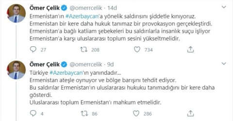Sosyal medya hesabından açıklamalar yapan AK Parti Sözcüsü Ömer Çelik, “Ermenistan’ın Azerbaycan’a yönelik saldırısını şiddetle kınıyoruz. Ermenistan bir kere daha hukuk tanımaz bir provokasyon gerçekleştirdi. Ermenistan’a bağlı katliam şebekeleri bu saldırılarla insanlık suçu işliyor Ermenistan’a karşı uluslararası toplum sesini yükseltmelidir. Türkiye Azerbaycan’ın yanındadır. Ermenistan ateşle oynuyor ve bölge barışını tehdit ediyor. Bu saldırılar Ermenistan’ın uluslararası hukuku tanımadığını bir kere daha gösterdi. Uluslararası toplum Ermenistan’ı mahkum etmelidir” ifadelerini kullandı.