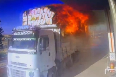 O anlar güvenlik kamerasına anbean yansıdı. Kasımlı Mahallesi'nde dün, kamyona yüklü saman balyalarından alevler yükseldiğini gören sürücü, aracı yol üzerindeki akaryakıt istasyonunun olduğu alana çekti. Sürücü, daha sonra kamyonu tarlada güvenli bir alana sürdü.