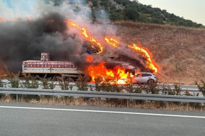 Balıkesir'de otoban üzerinde seyir halinde olan otomobil sürücüsü, önündeki tırın dorsesine arkadan çarptı. Çarpma sonucu çıkan yangında araçlar alev topuna dönerken, dorse ve otomobil kullanılamaz hale geldi. Kazada alevlerin arasından çıkan sürücüler de olayı yaralı olarak atlattı.