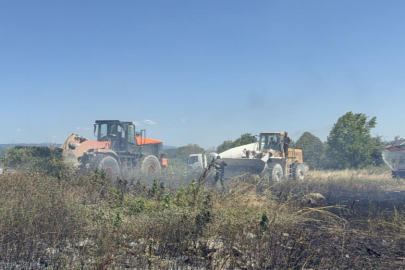 Düzce’de otluk alanda çıkan yangının ormanlık alana ulaşması, iş makineleri, beton mikserleri ve vatandaşların müdahalesi ile engelllendi.