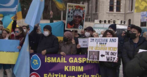 Rusya’nın 24 Şubat sabahı Ukrayna’ya başlattığı saldırıların dördüncü gününde İstanbul’da yaşayan Kırım Türkleri ve Ukraynalıların protesto gösterileri devam etti. Yaklaşık 250 kişilik grup, ellerinde Kırım ve Ukrayna bayraklarıyla Beyazıt Meydanı’na geldi. Ellerindeki döviz ve pankartlarla Rusya aleyhinde slogan atan grup, savaşın durması için çağrıda bulundu.