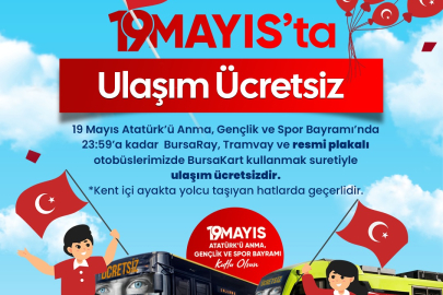 Bursa Büyükşehir Belediyesi, 19 Mayıs Atatürk’ü Anma, Gençlik ve Spor Bayramı’nda saat 23.59’a kadar BursaRay, tramvay ve otobüslerde BursaKart kullanmak suretiyle ulaşımın ücretsiz olacağını açıkladı. Bursalıların Hüdavendigar Kent Parkı’ndaki etkinliklere rahatça ulaşabilmesi amacıyla da 19 Mayıs’ı 20 Mayıs’a bağlayan gece BursaRay seferleri gece 01.00’e kadar uzatıldı. Ayrıca 18-19 Mayıs Pazar ve Pazartesi günleri saat 12.00 ile 23.30 arasında Acemler-Hüdavendigar Kent Parkı arasında ücretsiz ring servisi olacak. Yine 18-19 Mayıs tarihlerinde, Hüdavendigar Kent Parkı’ndan Uludağ Üniversitesi’ne saat 23.30’a kadar ücretsiz ulaşım da sağlanacak.