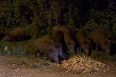 Bursa'da aç kalan domuz sürüsü şehir merkezine inerek bir süre yemek aradı.