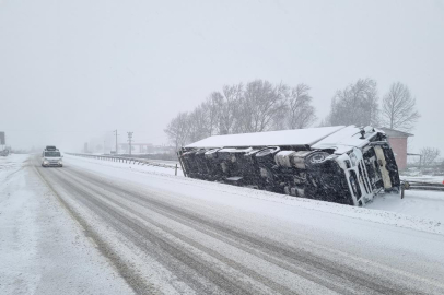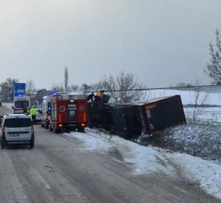 Karacabey ilçesi Uluabat mevkiinde de yoğun kar yağışı sebebiyle Bursa - İzmir Yolunun bir bölümü karla kaplanınca Bursa istikametinden Karacabey istikametine seyreden 20 AHS 587 plakalı tır karda kayıp orta refüje düştü. Yan yatan tırın sürücüsü kazadan yara almadan kurtuldu. Olayla ilgili jandarma ekipleri tahkikat başlattı.
