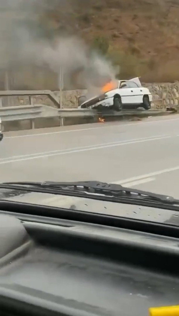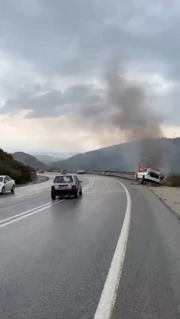 Bursa’da yağışlı havanın etkisiyle kontrolden çıkıp bariyerlere çarpan otomobil alev alev yandı. Sürücünün şans eseri hafif yaralandığı kazayla ilgili tahkikat başlatıldı.