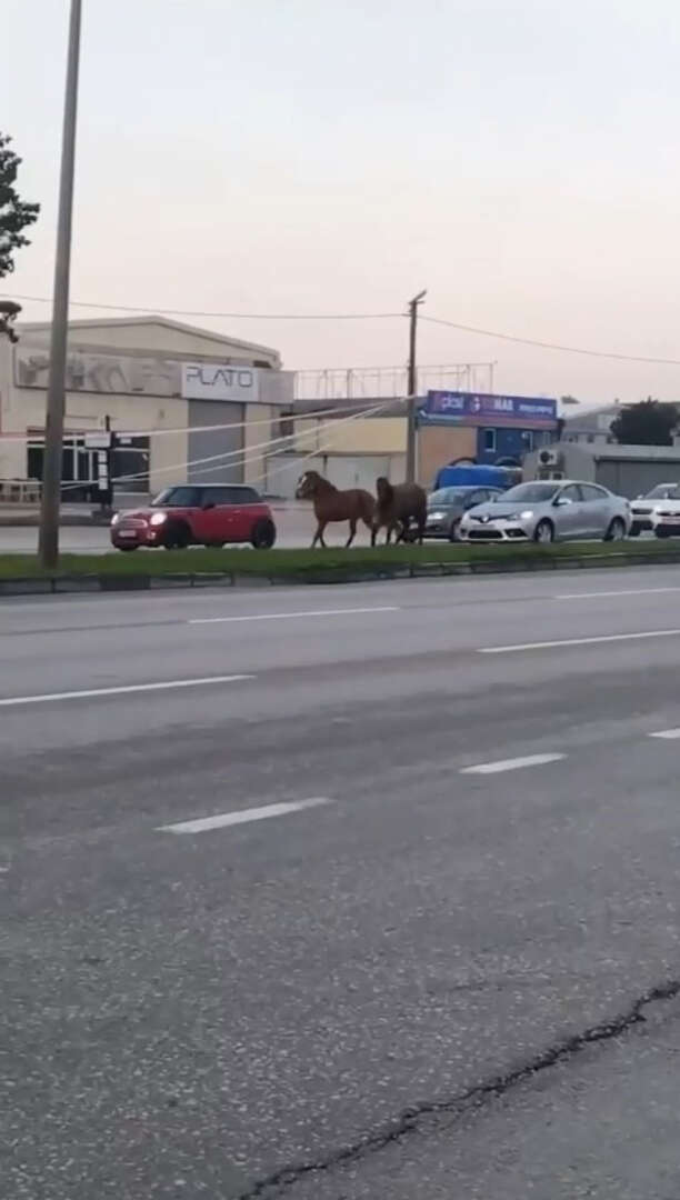 Bursa'da ana yol üzerindeki refüjde kalan başı boş atlar ne yapacağını şaşırdı. Araçların önüne inen atlar, korkunca yine yukarı çıktı.