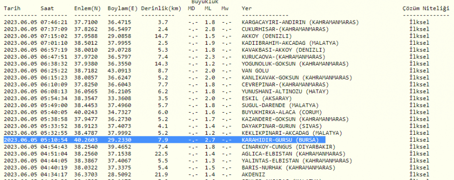 Kandilli Rasathanesi verilerine göre, Bursa'nın Gürsu ilçesinde sabah saat 05:10'da 2.7 büyüklüğünde deprem meydana geldi.