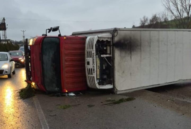 Kaza, Bursa-Ankara karayolu İnegöl girişinde meydana geldi. Edinilen bilgiye göre, Bursa'dan İnegöl istikametine seyir halinde olan Hasan Ş. (52) yönetimindeki 16 J 9995 plakalı kamyon, sürücüsünün direksiyon hakimiyetini kaybetmesi sonucu yol kenarında bulunan bir içecek fabrikasının duvarına çarptı. Çarpmanın etkisiyle kamyon devrildi.