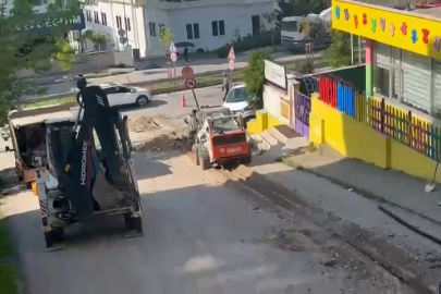 Bursa'da anaokulu önündeki sokaktaki altyapı çalışması esnasında, patlayan doğalgaz borusu herkesin yüreğini ağzına getirdi.
