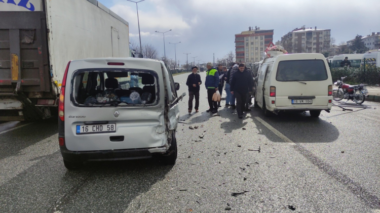 Alınan bilgiye göre Ersan Bozdağ (49) idaresindeki 16 VM 104 plakalı kapalı kasa bir minibüs ana yolda yol ortasına başka bir araçtan düşen meyve selesine çarpmamak için ani manevra yapınca önünde seyir halinde olan Avni İnci (72) yönetimindeki 16 CHD 58 plakalı hafif ticari araca arkadan çarptı.