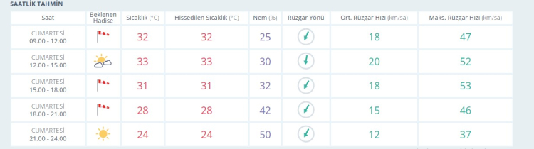 Az bulutlu ve açık geçeceği tahmin ediliyor. Rüzgarın; bölgenin güneybatuında kuzeyli yönlerden kuvvetli olarak (30-50 km/saat) esmesi bekleniyor.