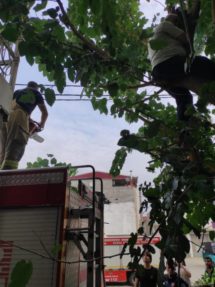 Olay, merkez Yıldırım ilçesi Mevlana Mahallesi'nde meydana geldi. Edinilen bilgiye göre, Ferzende A. (66), yaşadığı evinin bahçesinden gelen kedi sesini duyunca kediyi aramaya başladı. Kedinin ağaçta kaldığını gören yaşlı adam, ağaca tırmanarak kediyi indirmek istedi. Tırmandığı esnada kedi korkarak aşağı inince bu sefer yaşlı adam ağaçta mahsur kaldı. İhbar üzerine olay yerine polis, sağlık ve itfaiye ekibi sevk edildi. Büyükşehir Belediyesi İtfaiye Daire Başkanlığı ekiplerinin titiz çalışmasıyla ağacın dalı kesilerek yaşlı adam kurtarıldı. O anlar amatör kameraya yansırken, yaşlı adam ekiplere teşekkür etti.