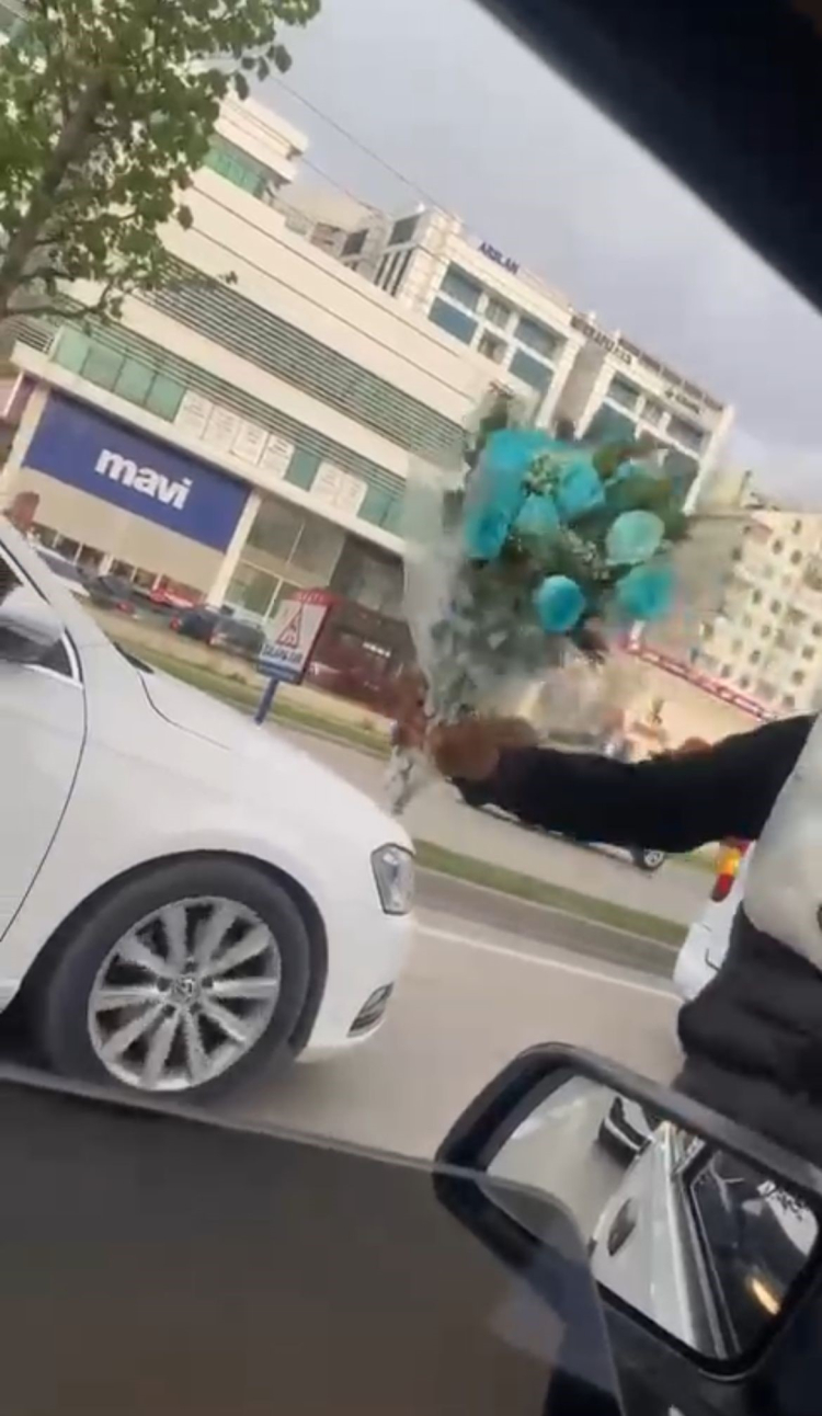 Olay, merkez Nilüfer ilçesi Konak Mahallesi Lefkoşa Caddesi üzerinde meydana geldi. Araçların arasında seyyar çiçekçilik yapan vatandaş, bir aracın içinden gelen müzik sesini duyunca çiçekleri bıraktı. Bir anda oynamaya başlayan seyyar çiçekçi, trafikte bekleyen vatandaşları gülümsetti. O anlar kameraya yansıdı.