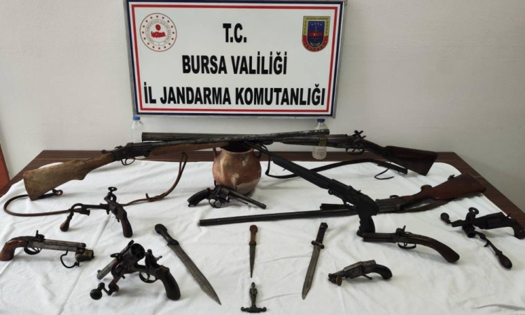 Bursa'nın Osmangazi ilçesinde jandarma tarafından düzenlenen operasyonda, çok sayıda tarihi eser niteliğinde silah ve obje ele geçirildi.