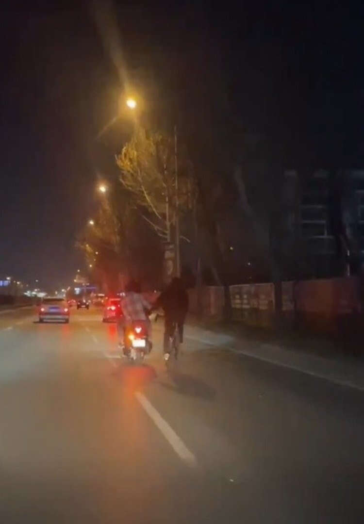 Bursa'da akan trafikte motosikletteki arkadaşına tutunarak ilerleyen bisiklet sürücüsü tehlikeye davetiye çıkardı.