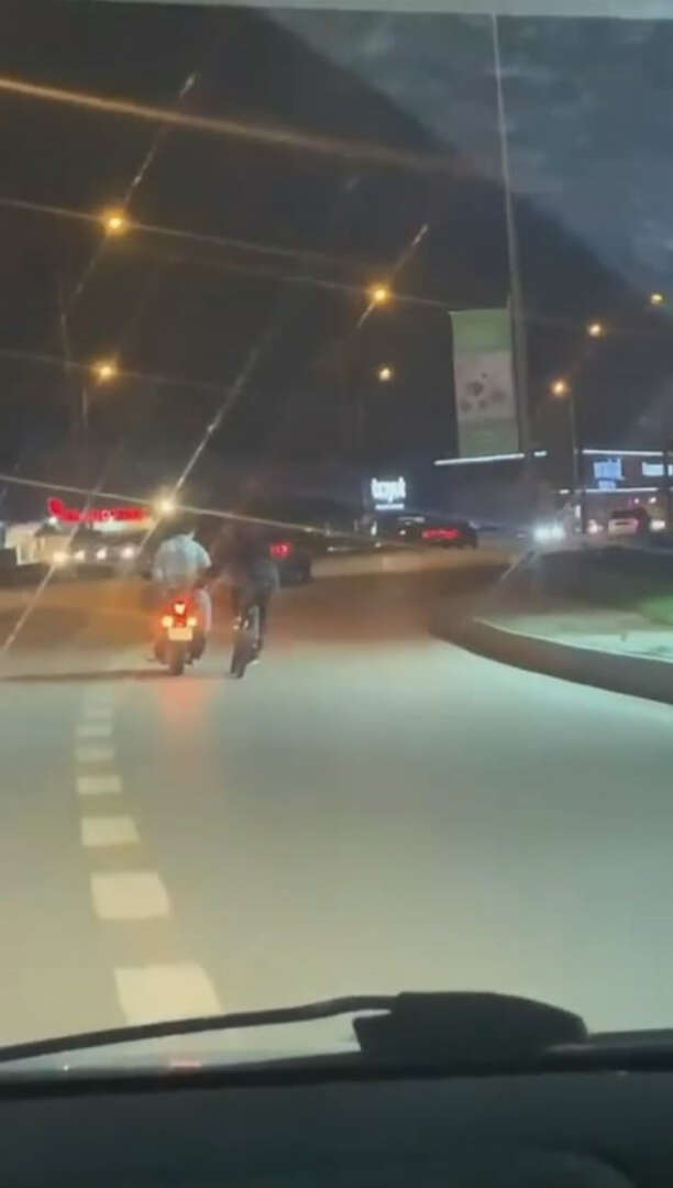 Olay, Sanayi Caddesi üzerinde meydana geldi. Edinilen bilgiye göre, trafikte seyreden motosiklet sürücüsü yolda gördüğü bisiklet sürücüsünün elinden tuttu. Beraber seyretmeye başlayan motosiklet ve bisiklet sürücüsünün tehlikeli yolculuğu amatör kameraya yansıdı