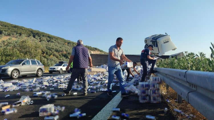 Bursa'da TIR devrildi: 25 ton içecek yola saçıldı