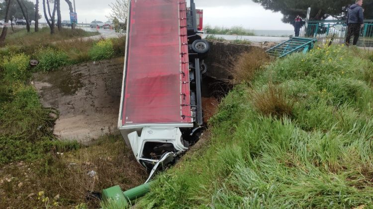 Bursa'da virajı alamayan kamyon dereye uçtu