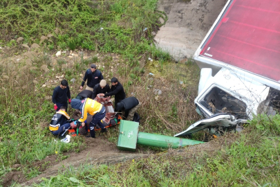 Bursa'nın Orhangazi ilçesinde virajı alamayan kamyon, karşı yönden gelen hafif ticari araca çarptıktan sonra dere yatağına uçtu. Kazada 2 sürücü de sıkıştıkları araçlardan itfaiye yardımıyla çıkarılarak hastaneye kaldırıldı.