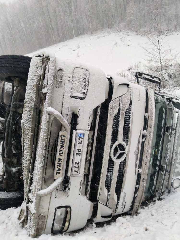 Kaza, İnegöl ile Kütahya'nın Domaniç ilçesini birbirine bağlayan karayolu Arapoturağı mevkiinde meydana geldi. Domaniç'ten İnegöl'e seyir halinde olan İsmail K. (41) idaresindeki 43 PE 277 plakalı tır, kar yağışı sebebiyle sürücüsünün kontrolünden çıktı. Savrulan tır yoldan çıkarak devrildi. Kaza sonucu sürücü ile yanındaki Aysel K. (60) yaralandı. Yaralılar kaza yerine sevk edilen ambulansla Domaniç ilçe Devlet Hastanesine kaldırıldı. Jandarma ekipleri kazayla ilgili soruşturma başlattı.