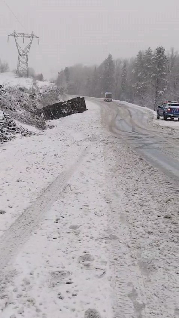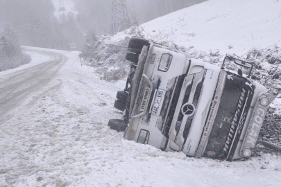 Bursa'nın İnegöl ilçesinde kar yağışı sebebiyle kayarak yoldan çıkan tır devrildi. Kazada 2 kişi yaralandı.