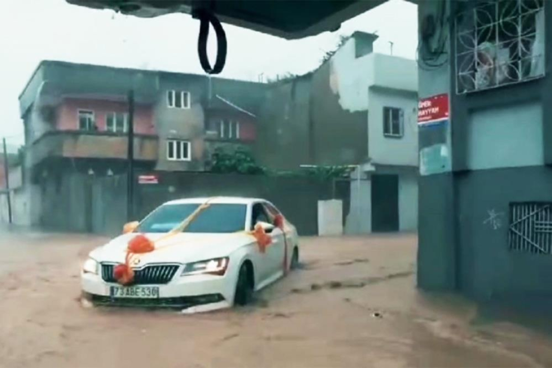 Selin etkilediği Cudi Mahallesi'nde su basan sokaklarda bir gelin arabası sel sularının ortasında kaldı. Sel suyunun yükselmesi ile kurtulmaya çalışırken sürücünün elindeki silecekle camı temizlemesi ise kameraya yansıdı.