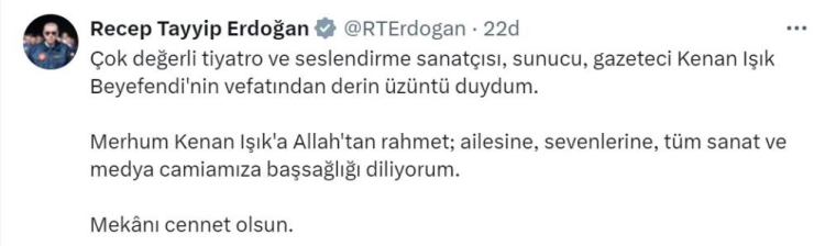 "Çok değerli tiyatro ve seslendirme sanatçısı, sunucu, gazeteci Kenan Işık Beyefendi'nin vefatından derin üzüntü duydum. Merhum Kenan Işık'a Allah'tan rahmet; ailesine, sevenlerine, tüm sanat ve medya camiamıza başsağlığı diliyorum. Mekânı cennet olsun."