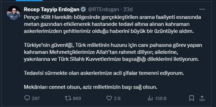 Cumhurbaşkanı Recep Tayyip Erdoğan, Pençe-Kilit Harekatı bölgesinde metan gazından etkilenerek şehit olan 5 asker için taziye mesajı yayımladı.