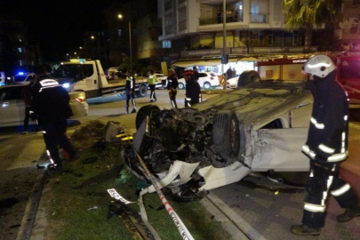 Antalya’da tali yoldan aşırı hızlı şekilde çıkan otomobil seyir halindeki başka bir araca çarparak takla attı. Otomobile çarptıktan sonra refüj ve tabelayı parçalayarak takla atan ve ehliyeti bulunmayan otomobil sürücüsü olay yerini terk ederken, kazada 4 kişi yaralandı.