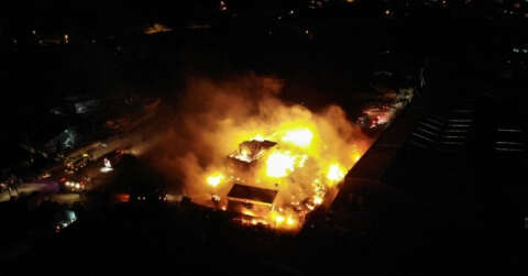 Kocaeli’nin Gebze ilçesinde elektrik kontağından çıkan yangında palet fabrikasının açık alanda bulunan palet deposu alev alev yandı. Yangın alanı ise havadan görüntülendi.