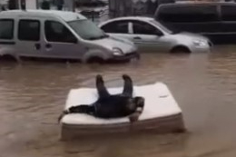 Trabzon’da şiddetli yağış, kent genelinde hayatı olumsuz etkiledi. Yağış nedeniyle birçok noktada yollar ve caddeler göle döndü, ulaşım güçlükle sağlandı. Ortahisar ilçesi Pazarkapı Mahallesi de selden en fazla etkilenen noktalardan biri olurken, bir vatandaşın mahalledeki bir mobilya dükkanından aldığı yatağını suyun üzerine bırakarak adeta "sal" gibi kullanması görenleri güldürdü.
