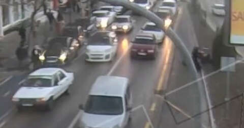 Kent Güvenlik Yönetim Sistemi kameralarına yansıya görüntüde ilginç kaza 102. Cadde üzerinde meydana geldi. Kırmızı ışıkta bekleyen araçların hareket etmesiyle birlikte bir kadının, 3 şeritli yolda, 2 şeridi güvenli şekilde geçtiği, en soldan gelen motosikletin ise kendisine çarpmamak için manevra yaptığı görüldü. Görüntülerde kadına hafif şekilde çarpan motosiklet sürücüsünün refüje devrildiği ve kadının ise geri kaçmaya çalıştığı anlar kaydedildi. Kadının daha sonra düşen sürücüye yardım etmeye çalıştığı ablar an be an kameralara yansıdı.
