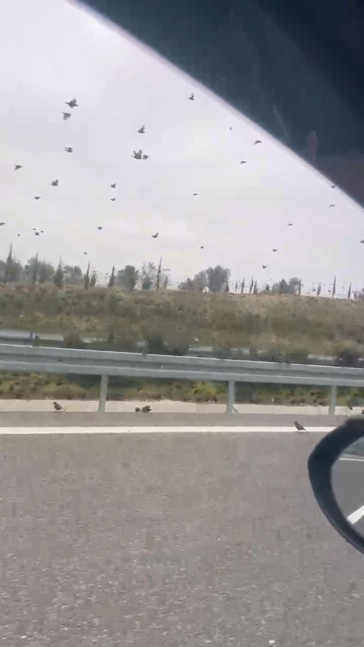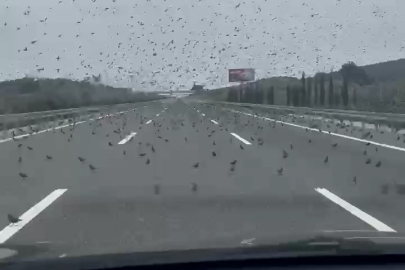 Yüzlerce sığırcık soğuk hava sebebiyle Bursa-İzmir otobanı üzerine kondu. Sığırcıklara çarpmamak için neredeyse durma noktasına gelen sürücüler o anları cep telefonlarıyla görüntülediler.