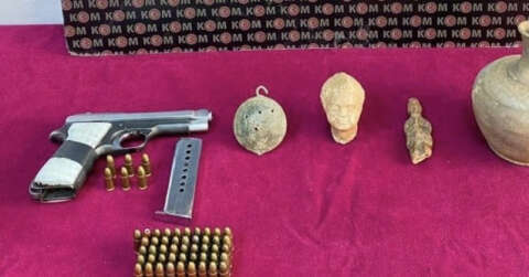 Ödemiş İlçe Emniyet Müdürlüğü Kaçakçılık ve Organize Suçlarla Mücadele (KOM) ekipleri, ilçede bulunan bir evde tarihi eser bulunduğuna yönelik aldığı bilgi üzerine çalışma başlattı. Polis ekipleri önceden belirlenen adrese Ödemiş Cumhuriyet Başsavcılığı koordinesinde operasyon düzenledi. Adreste yapılan aramalarda Roma dönemine ait 1 adet testi ve insan yüzü figürü, Bizans dönemine ait bronz kemer tokası, 1 adet heykelcik, 1 adet tabanca ve şarjörü ile 52 adet tabanca fişeği ele geçirdi. Olayla ilgili F.D. polis ekiplerince gözaltına alındı. Şüphelinin emniyetteki işlemleri sürdüğü bildirildi.