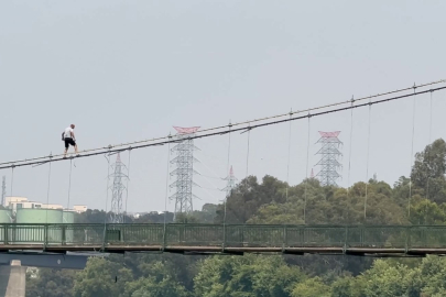 Adana'da etkili olan sıcaklar nedeniyle gençler, serinlemek için Seyhan Nehri üzerindeki Gençlik Köprüsü'nün halatlarına tırmanarak suya atladı. Tehlikeli o anlar ise kameraya yansıdı.