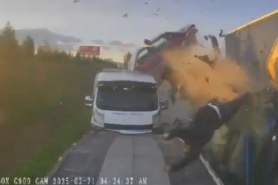 Öte yandan, kaza anı yol kenarında bulunan çekicinin araç kamerasına yansıdı. Görüntüde iki araç sürücüsünün araç kenarında bulunduğu esnada pikabın süratle araçlara çarpması, sürücülerin havaya savrulması anları yer aldı.