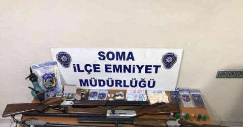 Manisa İl Emniyet Müdürlüğü Narkotik Suçlarla Mücadele Şube Müdürlüğü ve Soma İlçe Emniyet Müdürlüğü görevlilerince uyuşturucu veya uyarıcı madde ticareti yapan, nakleden ve kullanan şahıslara yönelik yapılan çalışmalar kapsamında, Soma ilçesinde 15 şahsa ait 15 ikamet adresinde sabah saat 07.00’da eş zamanlı olarak yapılan aramalarda, 8,88 gram metamfetamin maddesi, 4,5 gram esrar maddesi, 4 adet ruhsatsız tüfek, 20 adet kartuş, 5 adet uyuşturucu madde kullanmaya yarayan aparat, 2 adet çalıntı motosiklet, 900 TL uyuşturucu madde ticaretinden elde edildiği değerlendirilen para ele geçirildi. Konuyla ilgili gözaltına alınan 15 şüpheli şahıs hakkında adli işlemlere başlandığı bildirildi.