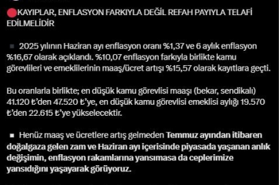 Memur-Sen Genel Başkanı Ali Yalçın, sosyal medya hesabından ‘Kayıplar enflasyon farkıyla değil, refah payıyla telafi edilmelidir’ notuyla yaptığı paylaşımda şu ifadelere yer verdi: "2025 yılının Haziran ayı enflasyon oranı yüzde 1,37 ve 6 aylık enflasyon yüzde 16,67 olarak açıklandı. Yüzde 10,07 enflasyon farkıyla birlikte kamu görevlileri ve emeklilerinin maaş/ücret artışı yüzde 15,57 olarak kayıtlara geçti. Bu oranlarla birlikte en düşük kamu görevlisi maaşı (bekar, sendikalı) 41 bin 120 liradan 47 bin 520 liraya, en düşük kamu görevlisi emeklisi aylığı 19 bin 570 liradan 22 bin 615 liraya yükselecektir. Henüz maaş ve ücretlere artış gelmeden temmuz ayından itibaren doğalgaza gelen zam ve haziran ayı içerisinde piyasada yaşanan anlık değişimin enflasyon rakamlarına yansımasa da ceplerimize yansıdığını yaşayarak görüyoruz. Açıklanan enflasyon rakamları ile sosyal hayatta yaşanan enflasyon arasındaki uçurum, bütün bireyler tarafından gün geçtikçe daha derinden hissedilmektedir. Enflasyon artış hızı düşse de maaşlardaki kayıp hızı artarak devam etmektedir. Geçim derdinin arttığı, kira fiyatlarının uçtuğu, maaş ve ücretlerin yoksulluk sınırıyla açlık sınırı arasında sıkıştığı bir dönemde kamu görevlilerimize ve emeklilerimize refah payı verilmesi ve iyileştirme yapılması şart olmuştur."