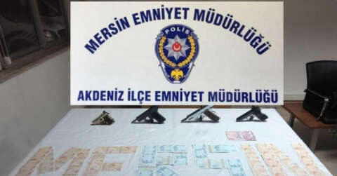 İl Emniyet Müdürlüğünden yapılan açıklamaya göre, Akdeniz ilçe Emniyet Müdürlüğü ekipleri Mesudiye Mahallesi’nde bulunan bir iş yerine operasyon düzenledi. Operasyonda daha önceden birçok suç kaydı bulunan S.A., G.D. ve M.E. isimli şahıslar gözaltına alınırken, iş yerinde yapılan aramalarda farklı marka ve kalibrelerde 4 ayrı ruhsatsız tabanca ile 2 adet 200, 23 adet 100 ve 86 adet 50’lik banknotlar halinde toplamda 7 bin lira sahte para ele geçirildi.