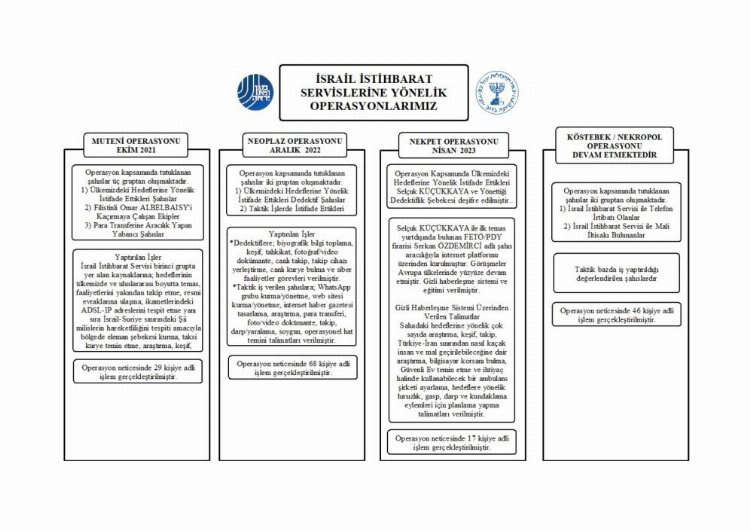 Milli İstihbarat Teşkilatı’nın İsrail İstihbarat Servisi bağlantılı şahıslara 2021 yılında başlattığı operasyonlar devam ediyor. Güvenlik kaynaklarından edinilen bilgilere göre, İsrail İstihbarat Servisinin ele aldığı yabancı şahıslara yönelik 2021’deki operasyon ile özel dedektifler ve taktik elemanlara yönelik 2022’deki operasyon sonrasında 58’i yabancı, 39’u Türkiye Cumhuriyeti vatandaşı toplam 97 kişiye uygulama yapıldı. İlk aşamada bunlardan 51’i tutuklanırken, söz konusu şahısların dava süreci devam ediyor. Öte yandan, İsrailli ajanlar ile yurtdışında düzenli şekilde buluşan ve İsrail İstihbaratının verdiği görevleri yerine getiren Selçuk Küçükkaya ve 16 kişiden oluşan şebeke Nisan 2023 ayında çökertildi.