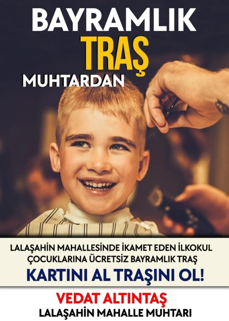 Bursa’nın Mustafakemalpaşa ilçesi Lalaşahin Mahallesi’nde ikamet eden ilkokul öğrencilerine yönelik “Bayramlık Traş Muhtardan” sloganıyla başlatılan kampanya kapsamında, çocuklara ücretsiz bayram traşı imkanı sunuluyor. Mahalle Muhtarı Vedat Altıntaş tarafından organize edilen bu projede, bayram öncesi çocukların temiz ve bakımlı görünmesi hedefleniyor. Lalaşahin Mahallesi'nde ikamet eden ilkokul öğrencileri, muhtarlığa başvurarak alacakları kart ile anlaşmalı berberlerde ücretsiz olarak traş hizmetinden faydalanabilecek.