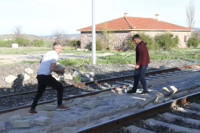 Çankırı'nın Korgun ilçesinde tren yolu kenarındaki yürüyüş yolunun yapımında çalışan ustalar, müteahhitten paralarını alamadıklarını iddia ederek, döşedikleri taşları söküp parçaladılar.