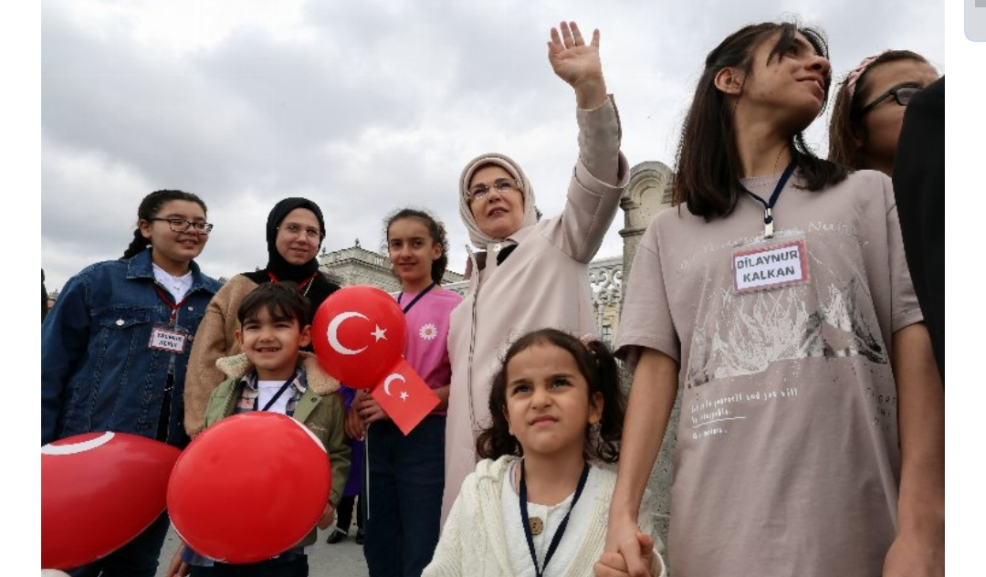 Cumhurbaşkanı Erdoğan'a bu sırada eşi Emine Erdoğan, Milli Eğitim Bakanı Mahmut Özer ile 23 Nisan Ulusal Egemenlik ve Çocuk Bayramı münasebetiyle ziyarete gelen depremzede çocuklar da eşlik etti.