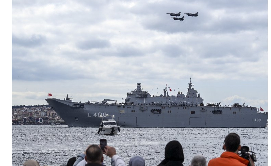 Türk Silahlı Kuvvetlerinin en büyük savaş gemisi yerli ve milli üretim TCG Anadolu, İstanbul Boğazı geçişi sırasında Cumhurbaşkanı Recep Tayyip Erdoğan'ı selamladı.