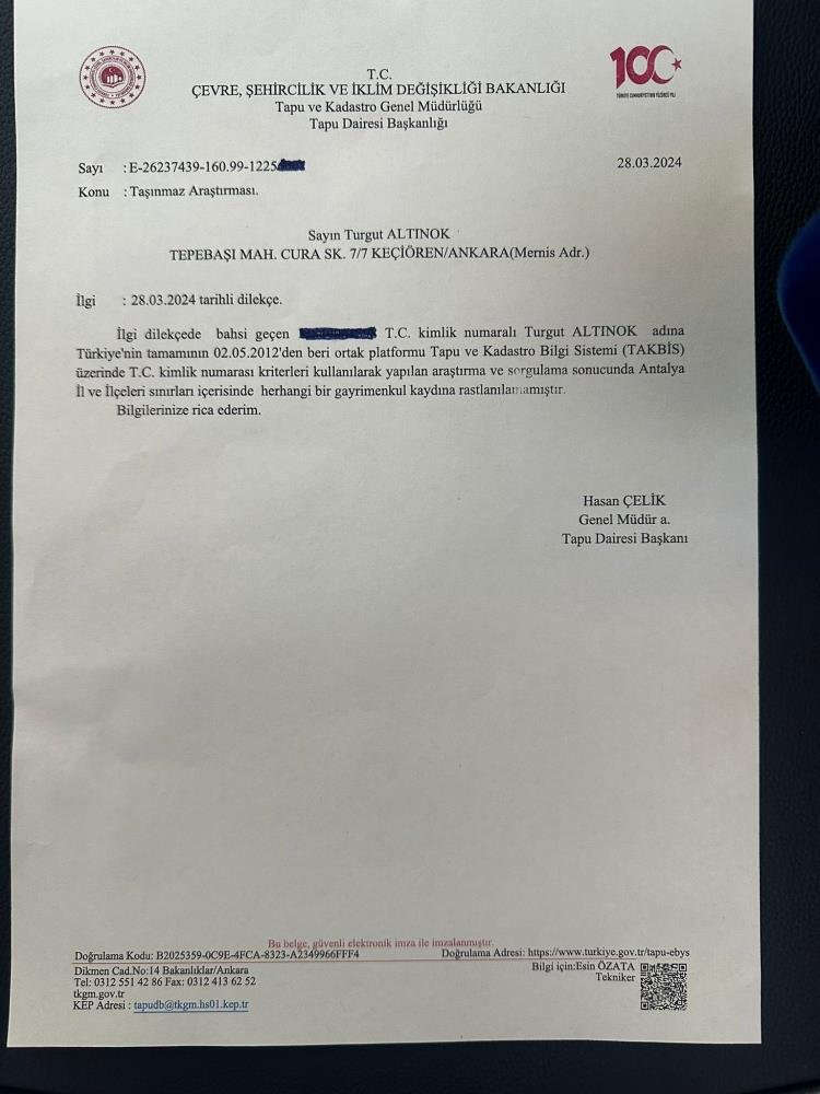 "Verdiğim dilekçenin sonucunda, 'İlgili dilekçede, 'Bahsi geçen T.C. kimlik numaralı Turgut Altınok adına Türkiye'nin tamamının 2 Mayıs 2012'den beri ortak platformu Tapu ve Kadastro Bilgi Sistemi (TAKBİS) üzerinde T.C. kimlik numarası kriterleri kullanılarak yapılan araştırma ve sorgulama sonucunda Antalya il ve ilçe sınırları içerisinde herhangi bir gayrimenkul kaydına rastlanmamıştır.' Bunu bütün kamuoyunun takdirine sunuyorum. Kimin yalancı, iftiracı, çamur ve kimin de dosdoğru olduğunun belgesidir."