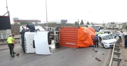 Virajı alamayan tır üzerine devrildiği otomobili hurdaya çevirdi: 2 yaralı